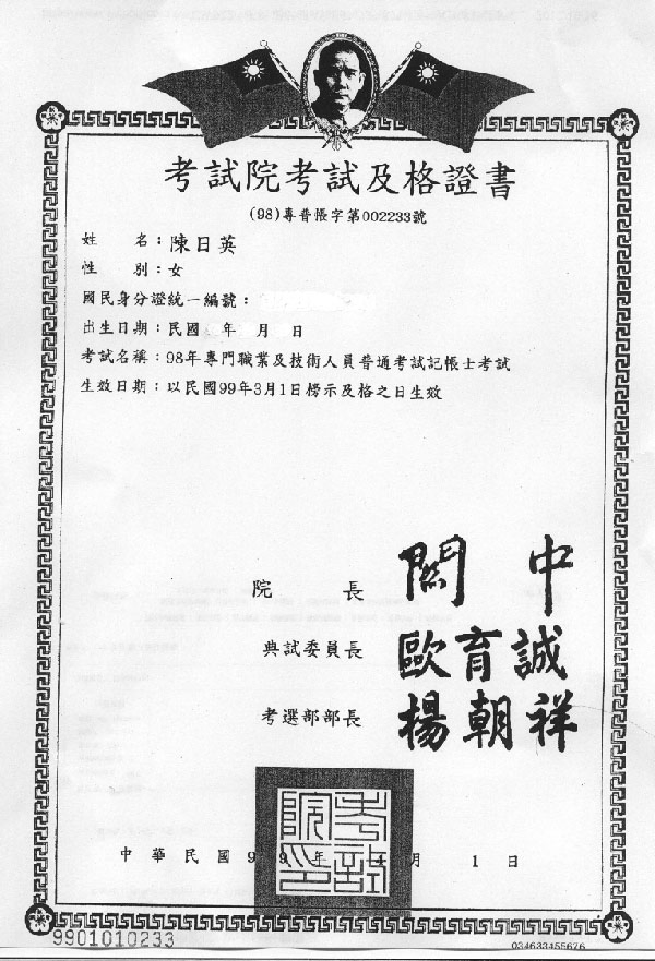 國家考試記帳士普考合格(98)專普帳字002233號財政部記帳士(99)台財稅證字第00749號